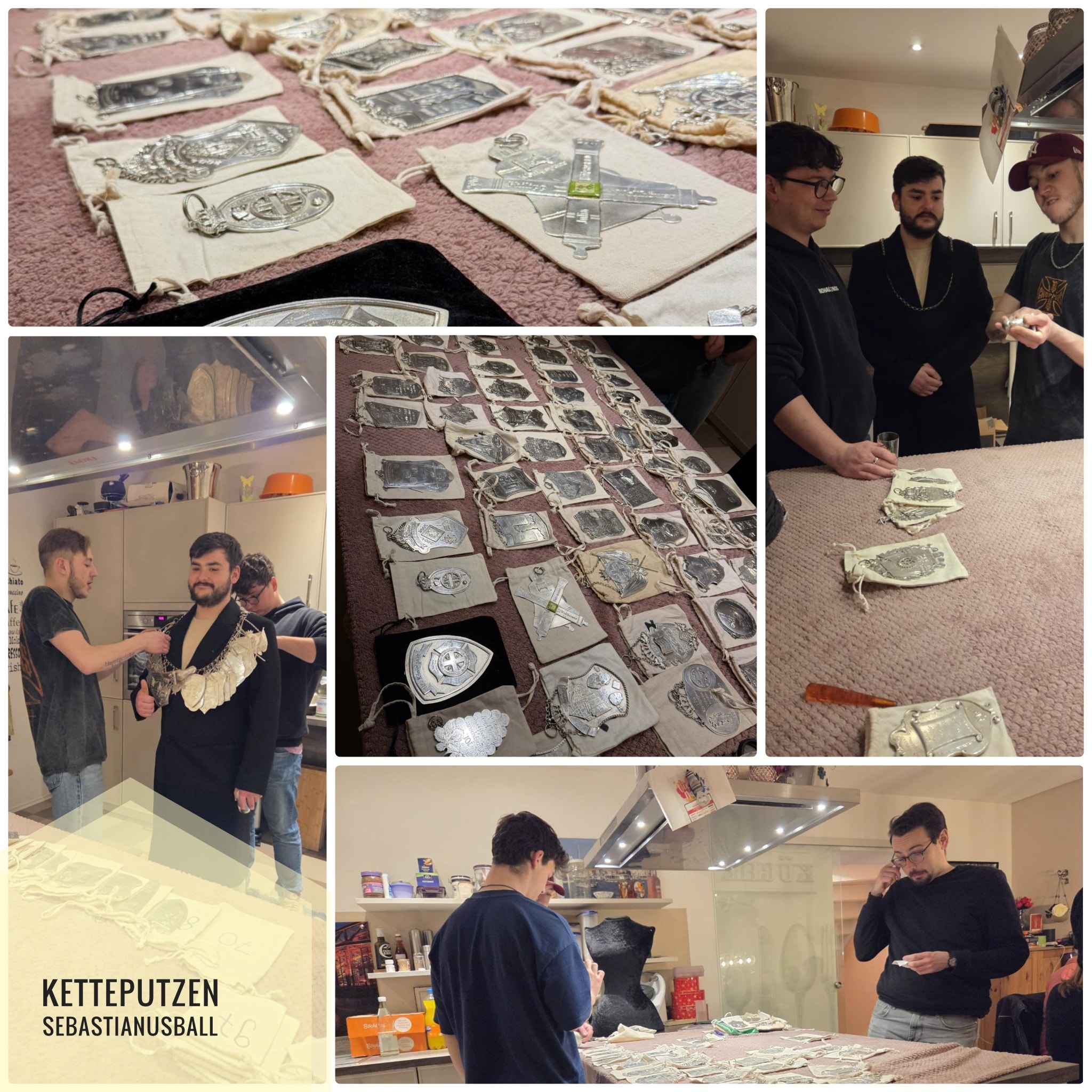 Heute ist der Patronatstag von unserem Schutzpatron Sankt Sebastianus. Dieser Tag ist bei uns immer mit einigen Festlichkeiten und Aufgaben verbunden. Diese haben wir am vergangenen Wochenende gefeiert. Donnerstag ging es los, denn unsere Königskette musste für den anstehenden Sebastianusball geputzt werden. Dazu trafen wir uns, um alle Schilder wieder auf Hochglanz zu bringen. Parallel machten sich die Begleiter daran, die Kette nach und nach zusammenzubauen. Bei dem ein oder anderen Wein ging dies dann auch schnell von der Hand.